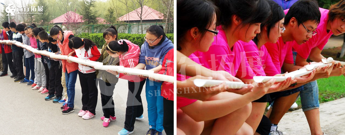 珠行千里是一個(gè)團(tuán)隊(duì)合作項(xiàng)目,偏趣味游戲類型,挑戰(zhàn)的任務(wù)是所有人利用手中的pvc管把球從A點(diǎn)運(yùn)送到B點(diǎn)。