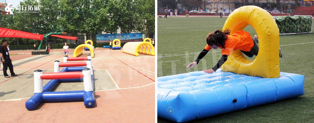 道具:沖氣道具一般由四個部分組成:跨欄、魚躍龍門、平衡木、拱門,跨欄和魚躍龍門兩個道具為特色道具,用的比較多,拱門和平衡木在實際比賽中,沒什么效果,可有可無。
