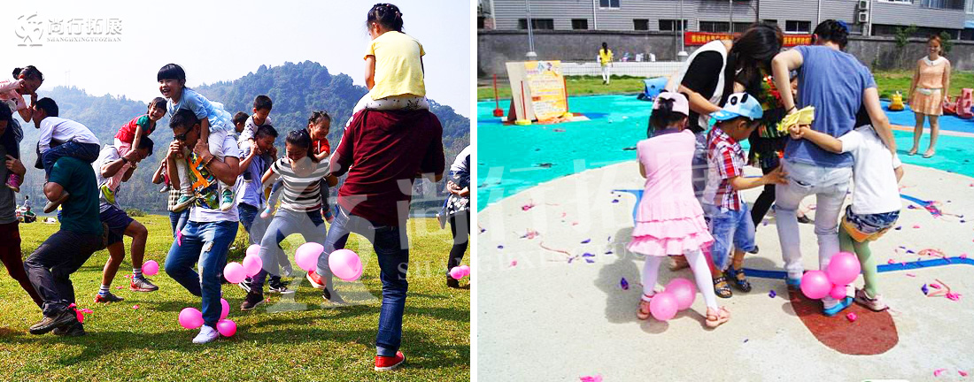 玩法:每個家庭由一名家長和一名幼兒參加,老師給每個家庭發(fā)一個氣球和一根細(xì)繩,請家長將氣球吹大綁在自己的腳腕,身背幼兒。聽到老師的口令游戲開始,家長就背著寶寶踩其他家庭的氣球,氣球被踩爆即被淘汰,比一比誰是冠軍。