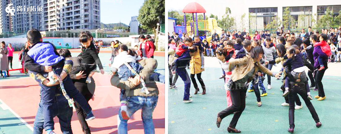 玩法:每個(gè)家庭由一名家長和一名幼兒參加,家長將孩子抱在懷里,在幼兒的屁股上掛一條尾巴,聽到口令后開始游戲,在保護(hù)好自己的尾巴的同時(shí)將別人的尾巴揪下來。