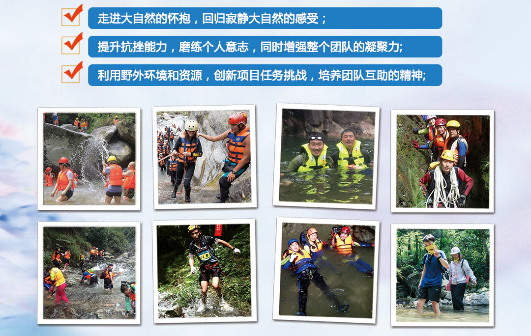 整個團(tuán)隊探險溯溪過程中,享受團(tuán)隊帶來的幫助,以及能夠及時幫助到身邊的伙伴,這是一個集體項目,目的是培養(yǎng)的是伙伴們的團(tuán)隊互助的精神。