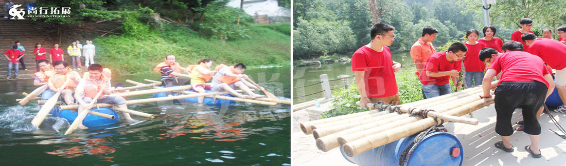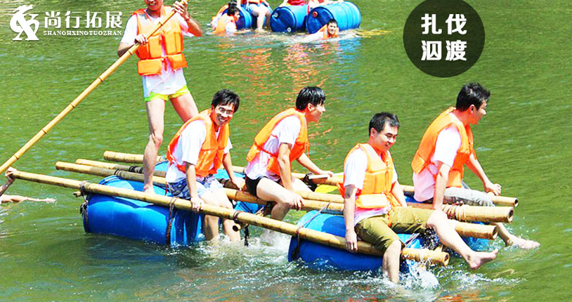 在特定的時間內(nèi),利用所給的毛竹、麻繩、大塑料桶扎出一條結(jié)實的竹筏,然后坐在竹筏上面抵達指定的目的地,集體動手創(chuàng)作出勞動成果,堅定目標,同心協(xié)力,駛向成功的彼岸。