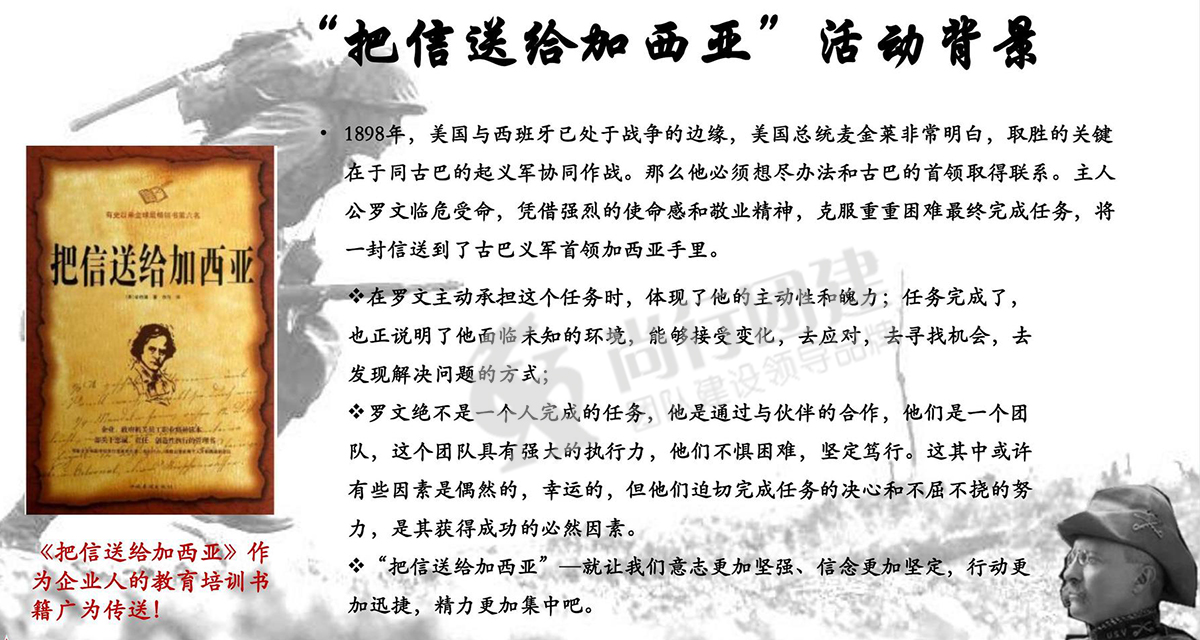有關(guān)如何把信送給加西亞的故事,有關(guān)送信人羅文,有關(guān)《致加西亞的信》這本書,在全世界范圍廣為流傳?!八托拧弊兂闪艘环N具有象征意義的東西,變成了一種忠于職守,一種承諾,一種敬業(yè)、服從和榮譽(yù)的象征。