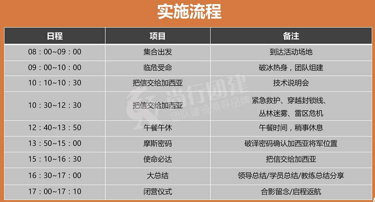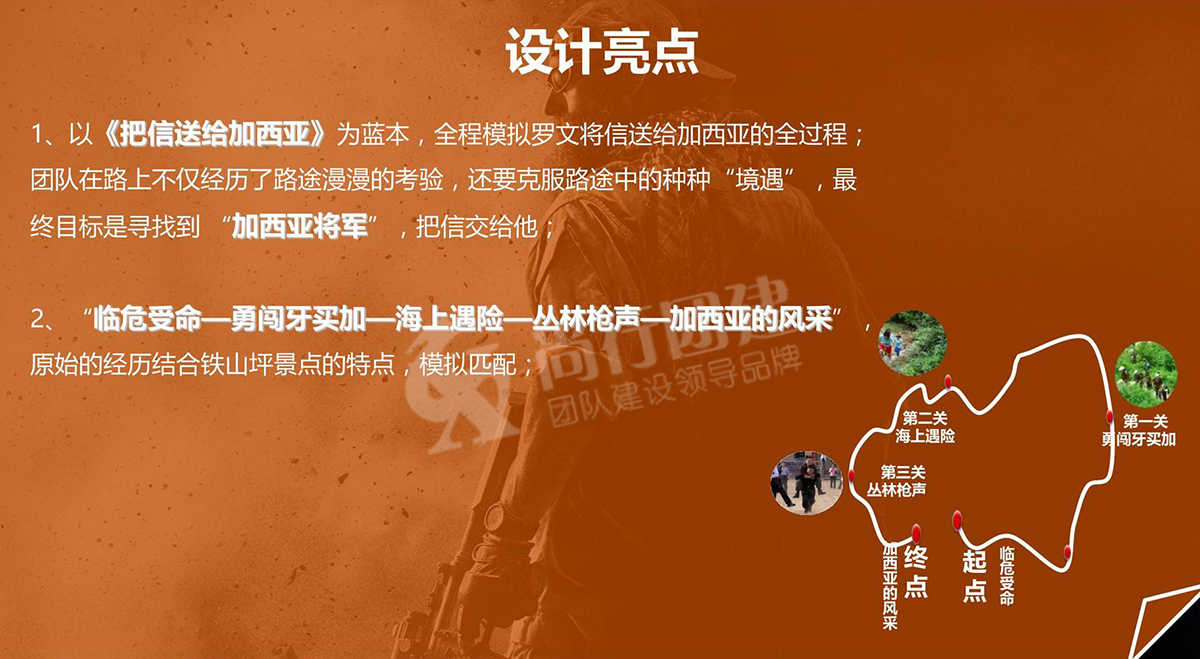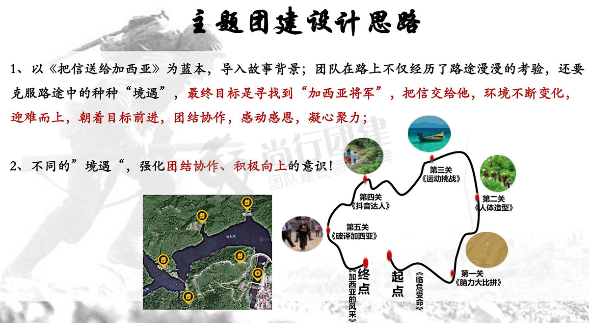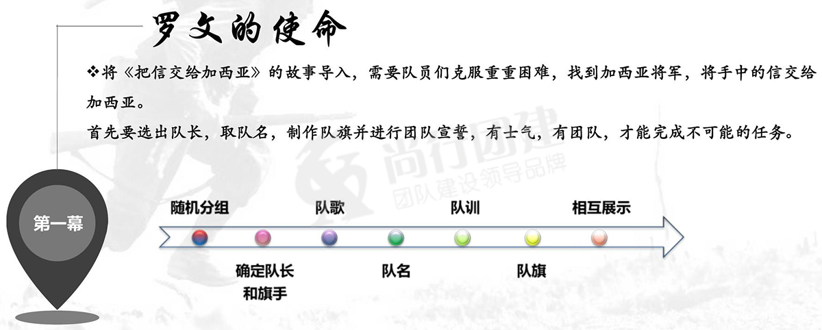 4、開始艱難的送信歷程:接受任務(wù),沿途要完成各種各樣的任務(wù),徒中充滿艱辛與考驗,參訓(xùn)者必須嚴(yán)格遵守規(guī)則,完成各種艱苦任務(wù),成功把信送給“加西亞”將軍;